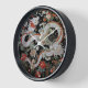 This wall clock features a pair of white Asian style dragons surrounded by flowers on a black background.