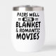 Funny saying - Pairs well with blanket and your favorite movies (change movie genre to suit your requirements) humor wine tumbler from Ricaso - a fun alcohol saying for the movie night. What type of movie will you pair your wine with?