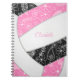 This cute volleyball themed notebook features the realistic image of an abstractly oversized volleyball that has pink, black and white panels with delicate hand-drawn doodle flowers, feathers and paislies in white patterned on the volleyball's pink and black panels - customize with the athlete's name - by katz_d_zynes