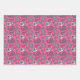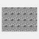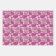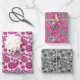 Wrapping paper in an ornate, lacy, paisley pattern in shades of light to deep fuchsia pink, accented with burgundy, on a pastel pink background, Black, white and gray on deep fuchsia pink, and black and white on a silver gray background