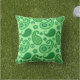 Throw pillow in an ornate paisley pattern, in shades of emerald green and light to deep jade green, on a light jade green background background