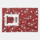 A kitchen towel featuring a red paisley design. Personalize with your name above red retro stove.