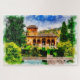 Gardens and reflective pools of the Partal Palace at the Alhambra, Granada, Andalusia, Spain. Watercolor style illustration.