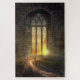 A lone warrior traveling down a dirt road with a stained glass window as backdrop.