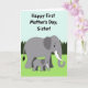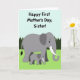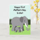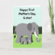 This card shows two stylized elephants in soft gray, an adult standing close beside a smaller youngster, their bodies filling the lower two-thirds of the design as they lean toward each other with a tender, family-close closeness ❤️. The pair stands on a bright lime-green ground that stretches across the bottom, giving the scene a cheerful base. Behind them, a small line of deep green evergreen trees sits in the distance, suggesting a quiet outdoor setting without adding clutter. The sky is a pale, airy blue, keeping the focus on the gentle shapes and the affectionate posture of the two figures. Across the upper portion, the message “Happy First Mother’s Day, Sister!” appears in black sans-serif letters, centered and easy to read. The smaller elephant angles slightly forward with a softly curved trunk, as if reaching toward the adult’s calm presence, adding a sweet note of closeness 🌼. The adult elephant’s stance feels protective, with both figures outlined simply so their connection reads at a glance. The trees form a dark green cluster near the horizon line under the pale blue sky.