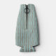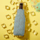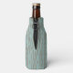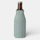 This bottle cooler has a geometric design of sort of flat-ended ovals repeating across the design in brown on a field of pale blue.