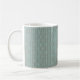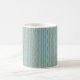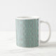 This mug has a geometric design of sort of flat-ended ovals repeating across the design in brown on a field of pale blue.