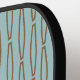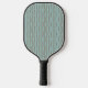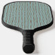 This pickleball paddle has a geometric design of sort of flat-ended ovals repeating across the design in brown on a field of pale blue.