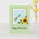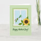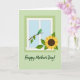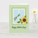This greeting card shows a calm home scene with a white-framed window set into a pale green wall, its light blue panes suggesting a clear day outside. A small emerald-green bird rests on a natural branch with a few soft green leaves, angled as if pausing to watch someone inside with gentle curiosity ❤️. Nearby, a golden flower with yellow-to-orange petals and a warm brown center leans in close, overlapping the window frame like a friendly hello 🌼. The colors stay soft and springlike, letting the window, bird, and flower feel quietly connected, like a shared moment between close companions. Along the lower area, the words “Happy Mother’s Day!” appear centered in dark green lettering, standing out against the light background. The text sits beneath the illustration so the picture remains the main focus while the message reads clearly at a glance. The branch stretches diagonally under the window, with the bird perched near the left side and the flower positioned to the right, partly crossing the frame.