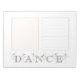 Design features one lined section and one pale pink section. Six ballerinas in pale pink tutus pose in different ballet positions around the word "Dance."