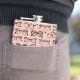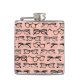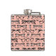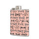 This flask features a variety of different eyeglasses and glasses frames in black and white on a pale pink.