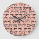 This wall clock features a variety of different eyeglasses and glasses frames in black and white on a pale pink.