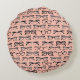 This round pillow features a variety of different eyeglasses and glasses frames in black and white on a pale pink.