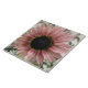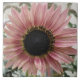 This awesome tile features a beautiful photograph of a pale pink sunflower. The sunflower is naturally pink and the petals have a pale pink outer ring and a darker pink inner ring. The middle where the seeds are is black. This photograph was taken in a garden.