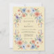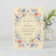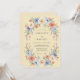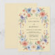 A soft pale yellow background provides a warm foundation for this delicate watercolor floral design. The artwork features a lush arrangement of peach roses, dusty blue petals, and purple sprigs reminiscent of lavender. This botanical aesthetic creates a whimsical and romantic mood suitable for an airy spring event.