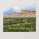 A travel postcard featuring a view of Palisade, Colorado with the Bookcliffs looming over the green valley and the Colorado River. The text is a template and easy to personalize.