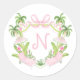 This sticker has a preppy grandmillennial design featuring pink and green Palm Beach preppy styled pool chairs and umbrellas surrounded by palm trees. The back has a pink and white cane webbing pattern. You can personalize with your monogram.