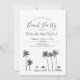A post-wedding beach party invitation featuring a watercolor image of a single coastal palm tree. Underneath are your unique party day details.