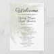 Flat, tropical beach wedding program template with palm fronds. White with black custom text on both sides, this program design has light green palm leaves as the background.