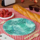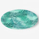 Paper plates in a tropical print of overlapping palm leaf silhouettes, in shades of turquoise / peacock and teal, against a light aqua background