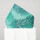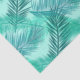Tissue paper in a print of overlapping palm leaf silhouettes, in shades of turquoise / peacock and teal, against a light aqua background