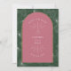 Arch design with line art and seashell illustrations and palm leaf background. Pink and green color scheme.