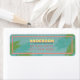 Palm Pool Address Label featuring a illustrated swimming pool water and palm fronds in a mid-century modern style. Designs include elements of blues, and pinks, palm leave fronds, swimming pool and retro design. Includes template for personal customization.