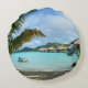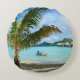 Round throw pillow with a palm tree on sand beach of a luxury overwater thatched roof honeymoon resort on the tropical island Bora Bora, near Tahiti in the pacific archipelago French Polynesia. Great decoration!