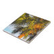 In a tropical mood, the original photograph by MaeFlowers on this small Ceramic Tile shows the top of a palm tree with its branches and trunk bathed in the warm glow of the afternoon sun. The long, pointed branches in the background are dark green, spreading out like fans. The branches in the foreground are a light yellow green, curving outward as they catch the sunlight. The tree trunk, normally a medium brown color, looks almost orange in the late afternoon light. A pale aqua blue sky background sets off the rich earth tones of the palm tree, and completes the tropical scene.