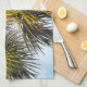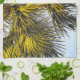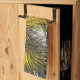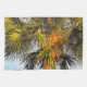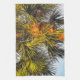 In a tropical mood, the original photograph by MaeFlowers on this Kitchen Towel shows the top of a palm tree with its branches and trunk bathed in the warm glow of the afternoon sun. The long, pointed branches in the background are dark green, spreading out like fans. The branches in the foreground are a light yellow green, curving outward as they catch the sunlight. The tree trunk, normally a medium brown color, looks almost orange in the late afternoon light. A pale aqua blue sky background sets off the rich earth tones of the palm tree, and completes the tropical scene.
