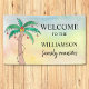 This family reunion banner is decorated with a palm tree on a watercolor background.
