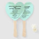 Tropical palm fronds wedding program in the shape of a heart. Create a fan program for an outdoor ceremony to keep the heat and bugs away. This program is light aqua blue with a background of long palm leaves. Customize black text on both sides for a simple and casual event.