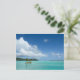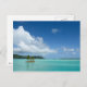 Postcard of a small island with a palm tree in the turquoise lagoon of the tropical island Bora Bora near Tahiti in French Polynesia.