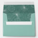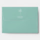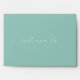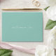 White line art illustration of palm leaves pattern over aqua green background inside with white text and palm tree design over aqua arch with tan border on flap . Address templates on back flap. Front features "deliver to" script