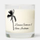 This custom favor candle features a modern black and white palm tree with your guests' names and table number. This trendy and modern candle is the perfect event place card that doubles as a favor gift.