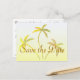 Pretty save the date wedding plans announcement with yellow palm trees with a hint of glitter in the print design. Brides and grooms can easily customize the templates. The design includes a template for the location of your wedding. This helps your invited guests have plenty of time to make travel plans and arrange airline reservations if needed. The palm trees have a glitter effect in the golden yellow design.