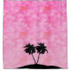 Shower curtain in a black silhouette of palm trees on a tropical island, against a soft dawn pink and coral background with back-lit clouds
