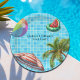 Hold an unforgettable pool party with this azure - light blue patio tile design that includes a palm tree, a beach ball, sun umbrella and fresh melon.
