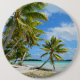 Button with a hanging palm tree on a white sand beach of a tropical island in the Pacific Ocean belonging to the Tahiti archipelago French Polynesia.