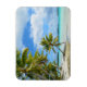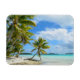 Rectangular photo magnet with a hanging palm tree on a white sand beach of a tropical island in the Pacific Ocean belonging to the Tahiti archipelago French Polynesia.