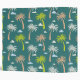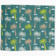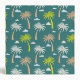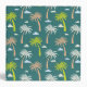 A mid century, retro pattern of white, green and light brown palm trees and white and blue clouds, against a darker green background.
