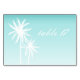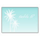 A wedding table number place card featuring an illustration of two palm trees over an aqua ombre background.