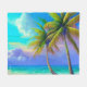 Introducing our cozy fleece blanket, featuring a stunning beach or tropical scene design that will take your relaxation to the next level. The design depicts two palm trees as night falls or as a storm rolls in, with a beautiful sky with varying shades of blue and other colors blending in like yellow and purple. You can almost feel the sand and ocean breeze just by looking at it!