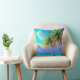 The prominent feature of this pillow's design is the two palm trees in the front right, which add a touch of nature and give the pillow a sense of depth. The intricate details and vivid colors of the palm trees bring the design to life and create a realistic portrayal of a beautiful tropical setting.
