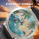 A vibrant wall clock design featuring tropical elements including palm trees, jumping dolphins, and a serene ocean sunset scene, evoking summer, nature, and marine vibes for your home decor.