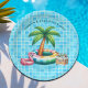 Hold an unforgettable pool party with this azure - light blue patio tile design that includes a palm tree, a cute flamingo and some cold refreshing drinks by the pool.