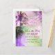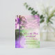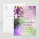 Romantic vintage save the date with rustic old palm trees, watercolor ombre purple background and dreamy string lights. Perfect save the date postcard for destination and beach weddings.