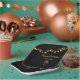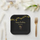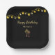 Tropical Beach Birthday party paper plate, with an elegant palm trees string lights design on a black background. With customizable typography lettering, you add your own information. A glamorous addition to your beach inspired dinner table.