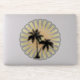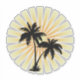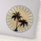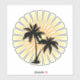 Graphic art of a silhouette of 2 palm trees with the sun shining behind
