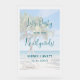 Wedding reception welcome sign with palm trees and beach scene background image. Frosted acrylic, large or small sign has wording, "Let's party with the Newlyweds" along with names of the couple and wedding date. Opaque, tropical-themed sign comes in many sizes. Text is dark sea blue color in script and printed fonts. The largest signs will bend, so plan to attach them to an easel, or other type of stand, in some way. Smaller signs will stand on their own in a holder. A protective film will cover the design and will need to be removed before use.